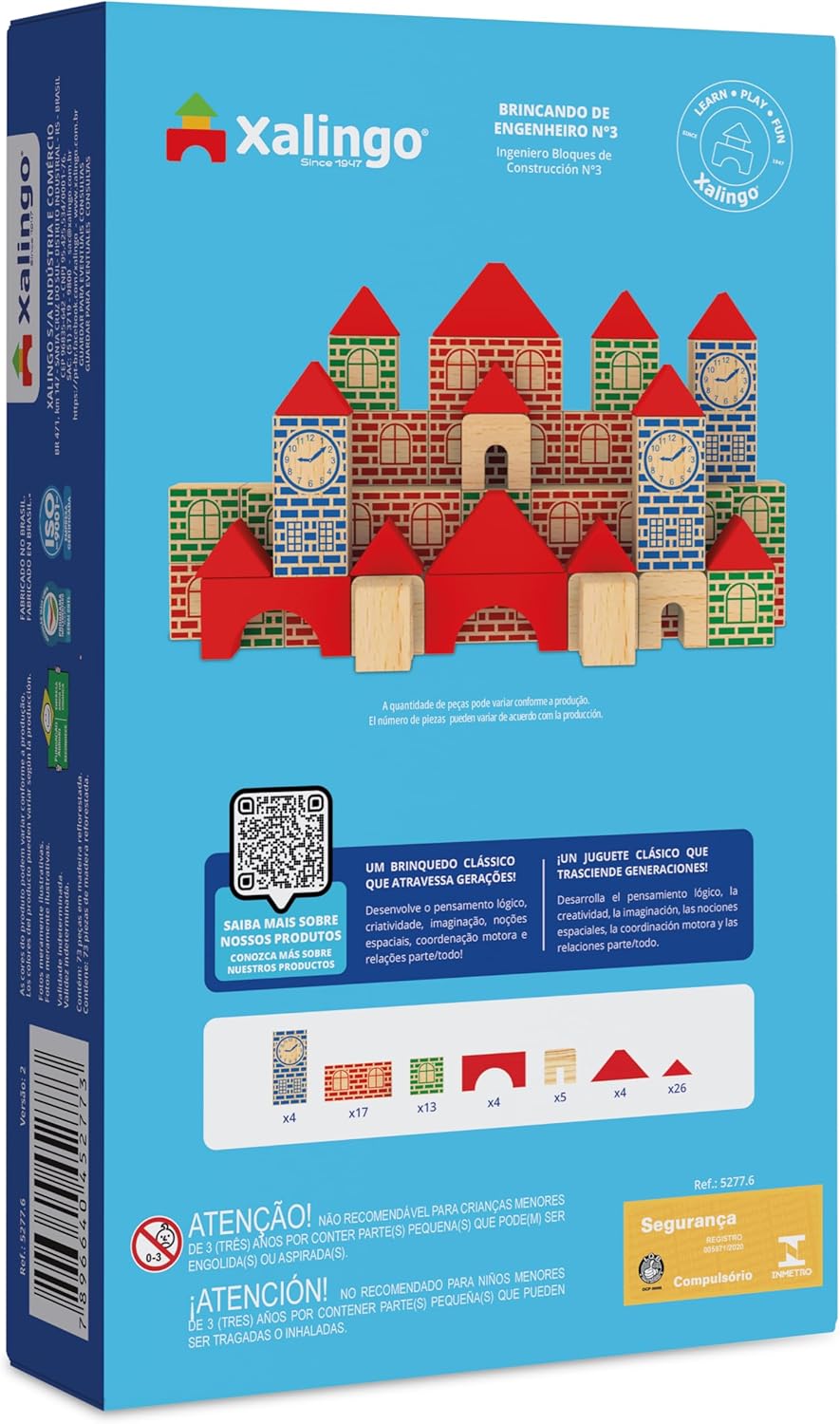 É possível divertir gerações com um mesmo produto. O jogo é composto por 73 peças confeccionadas  em madeira reflorestada e tinta atóxica.  São vários formatos , que possibilitam montagens infinitas, o que faz com  que suas criações fiquem do tamanho que você quiser, você pode montar pequenas cidades. O jogo contribui para o desenvolvimento do pensamento lógico e auxilia nas noções de espaço e coordenação motora da criança, podendo ser utilizado tanto individualmente quanto em grupo. Indicado para crianças acima de 3 anos. Indicação de idade + 3 Medidas: 26 x 5 x 21 cm “Caixa” Manual Download