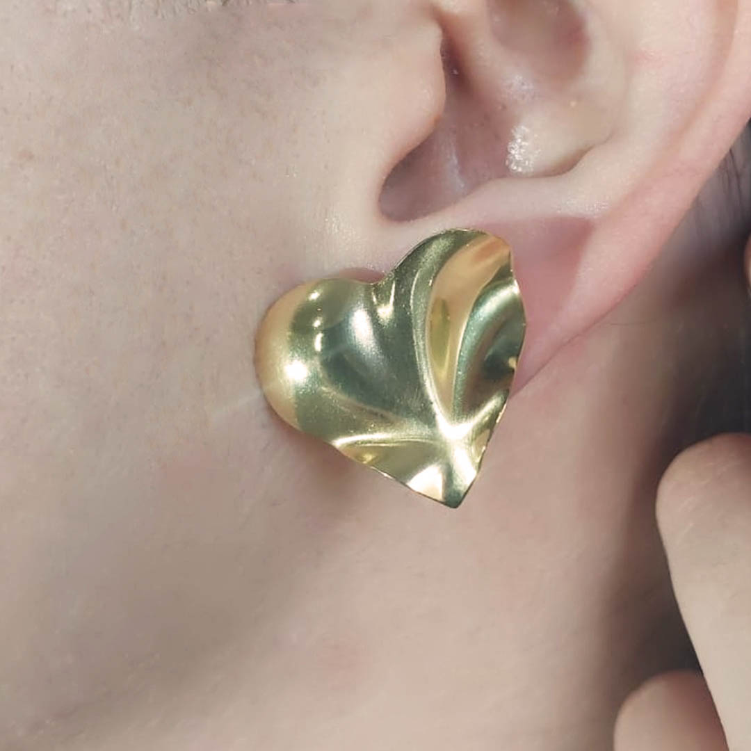 O Brinco Efeito Ondulado de Coração Folheado em Ouro 18k é o acessório perfeito para adicionar um toque exclusivo e luxuoso às suas semijoias.