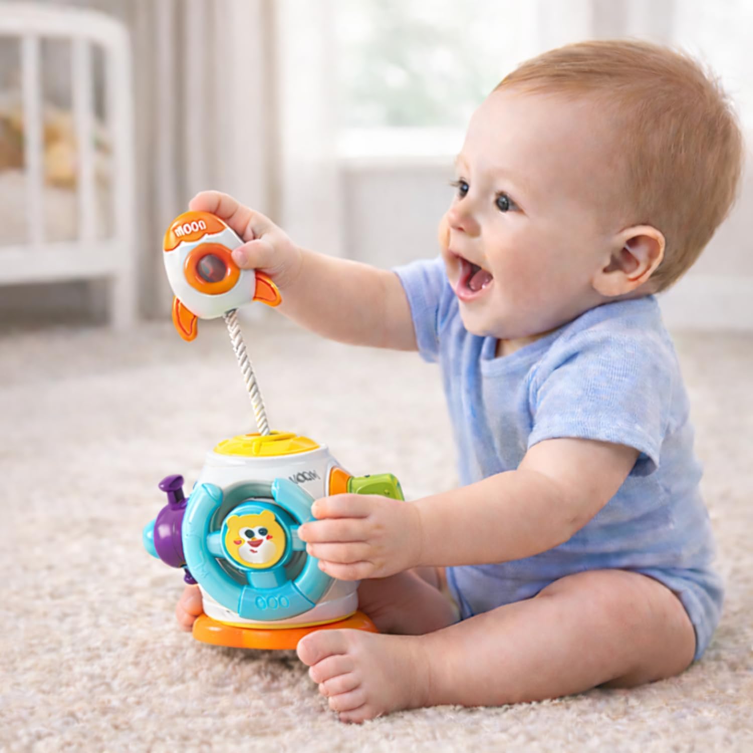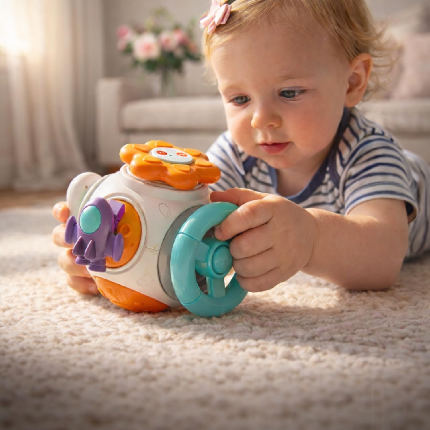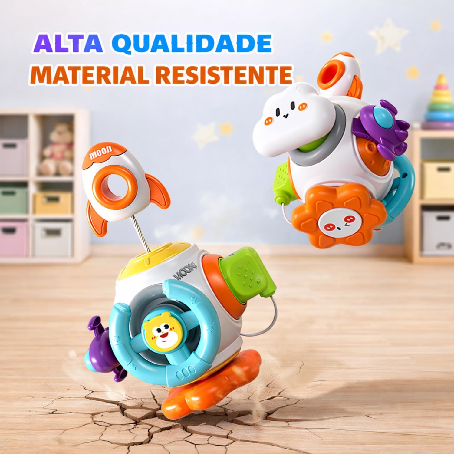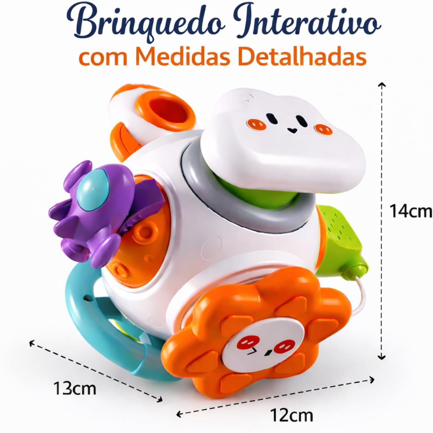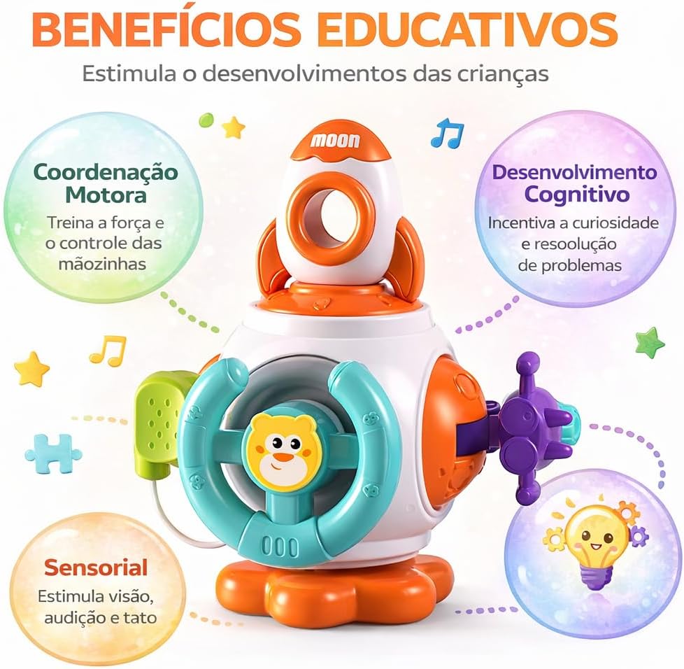 Com cores vibrantes e design atrativo, o brinquedo chama a atenção do bebê imediatamente, estimulando a visão e o foco. Suas diferentes texturas, formas e mecanismos — como engrenagens giratórias, botões interativos e peças móveis — ajudam a desenvolver a coordenação motora fina, além de fortalecer a percepção tátil. O formato ergonômico foi pensado para facilitar o manuseio por mãos pequenas, garantindo conforto e segurança durante o uso.