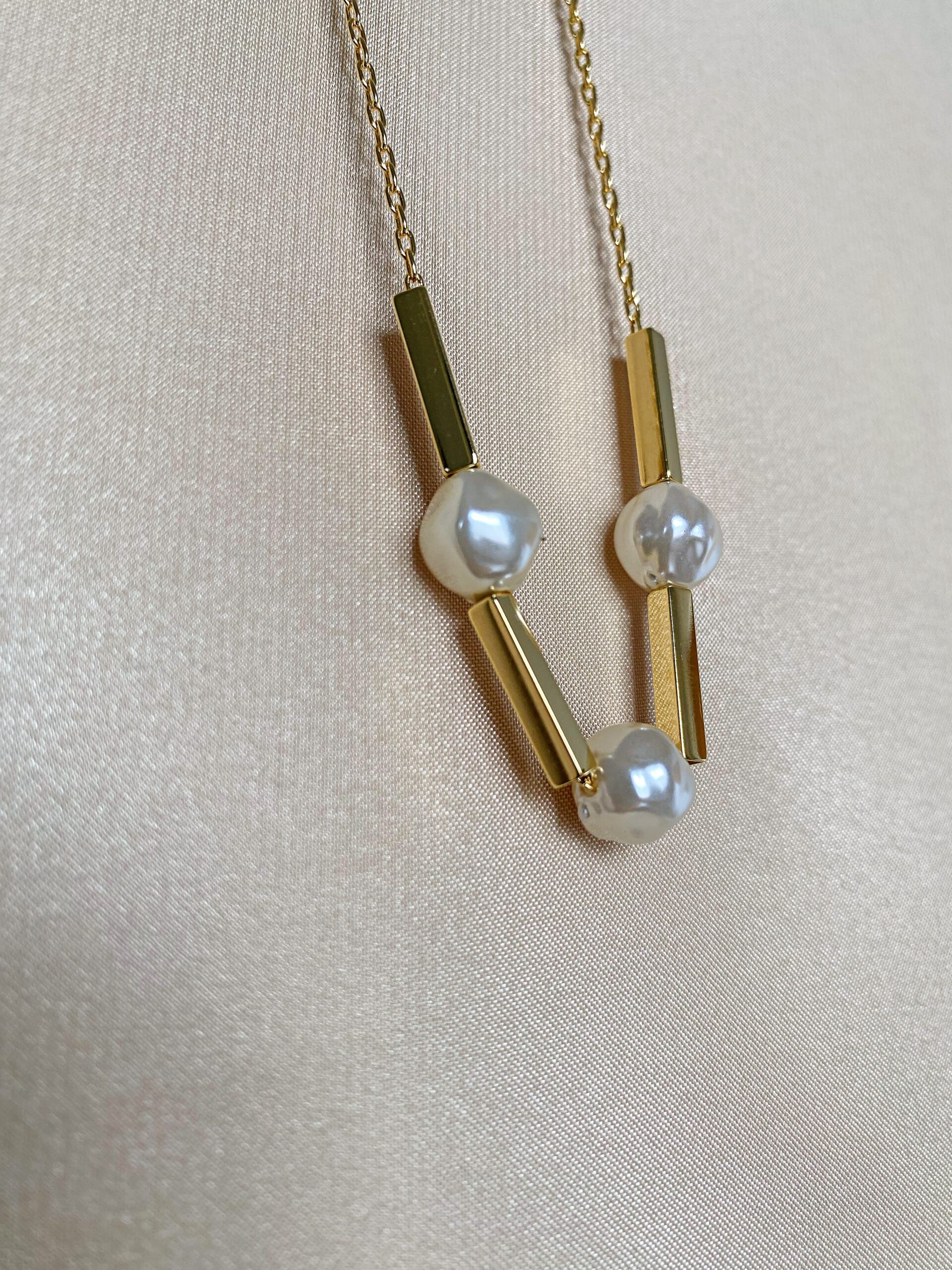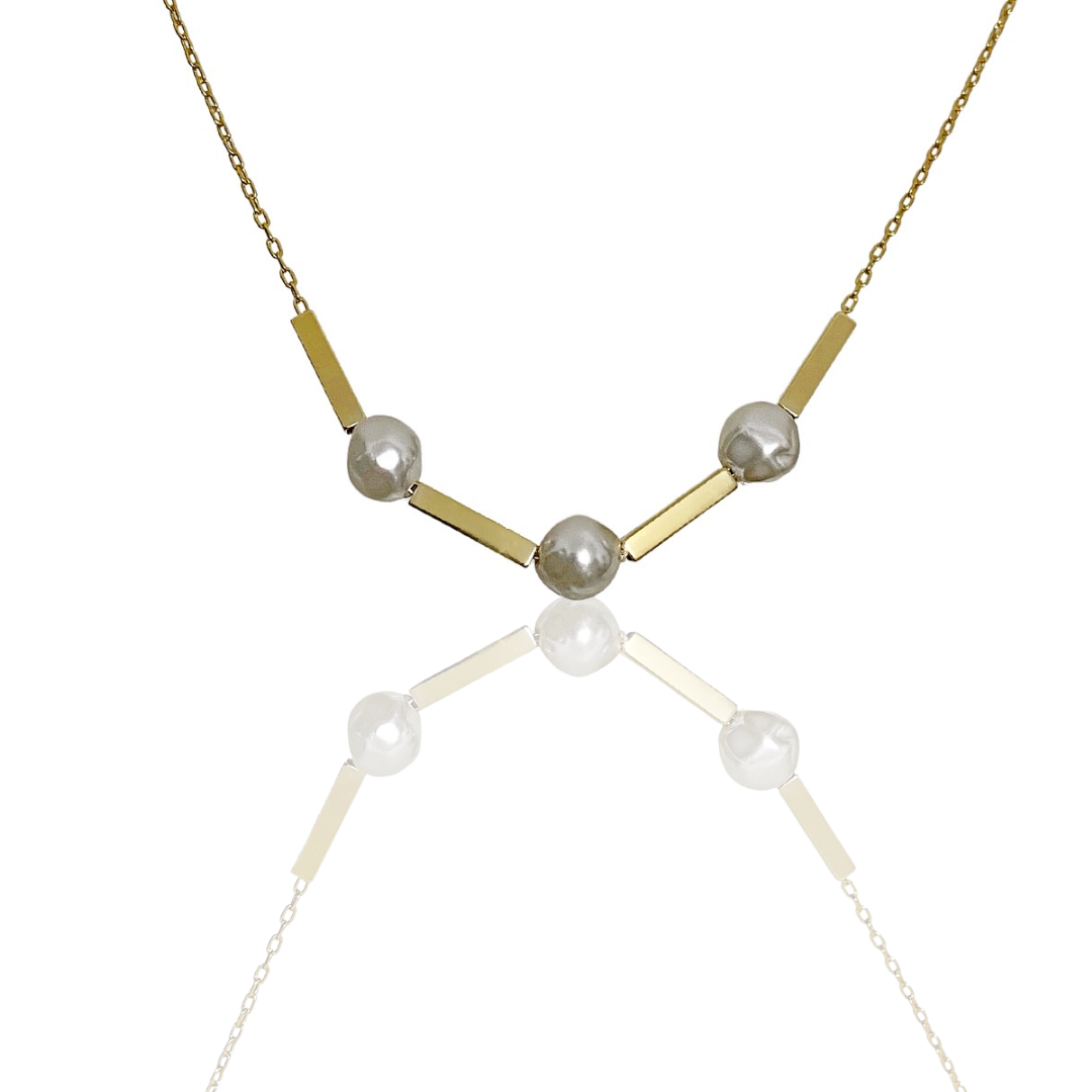 O Colar Pérola e Retângulo Folheado em Ouro 18k é uma peça encantadora que combina a beleza clássica das pérolas com um design moderno.