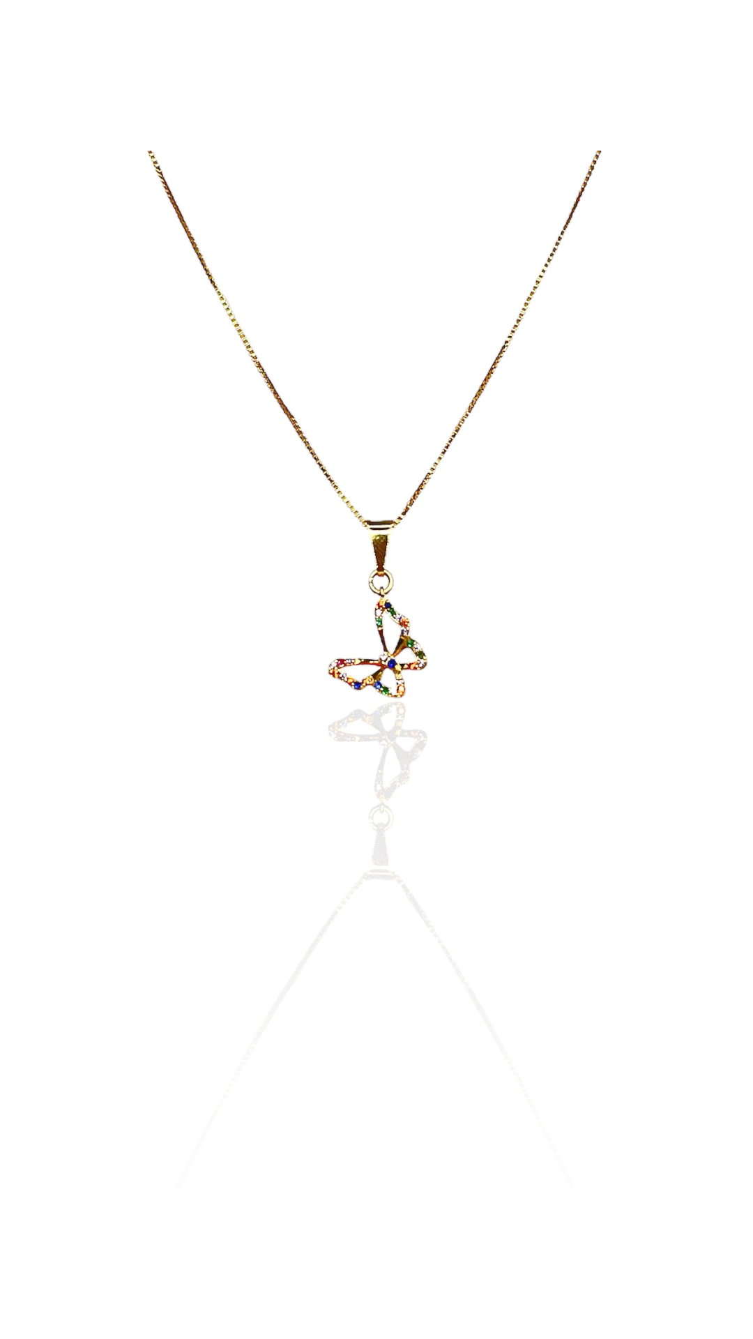 O pingente em formato de borboleta é delicadamente detalhado, com zircônias coloridas que adicionam um toque de brilho e alegria.