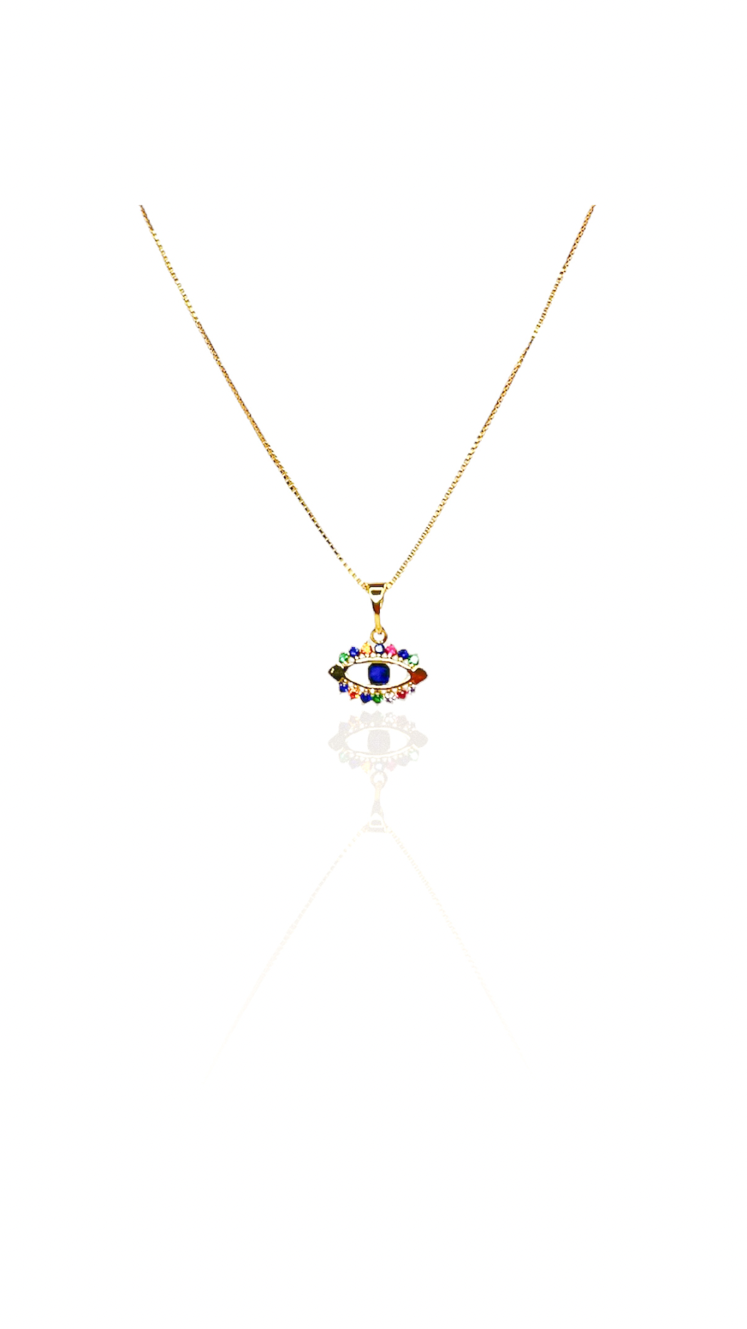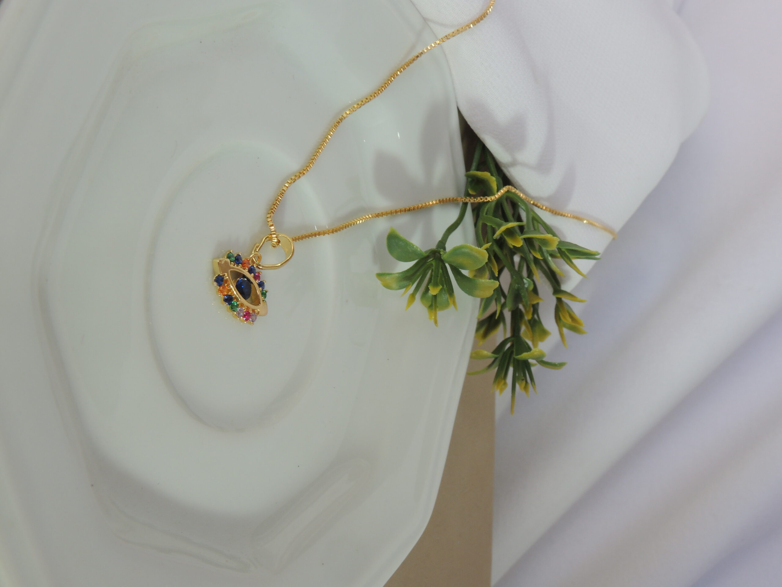 O Colar Pingente Olho Grego com Zircônia Multicolor Folheado em Ouro 18k é uma peça deslumbrante e cheia de significado.