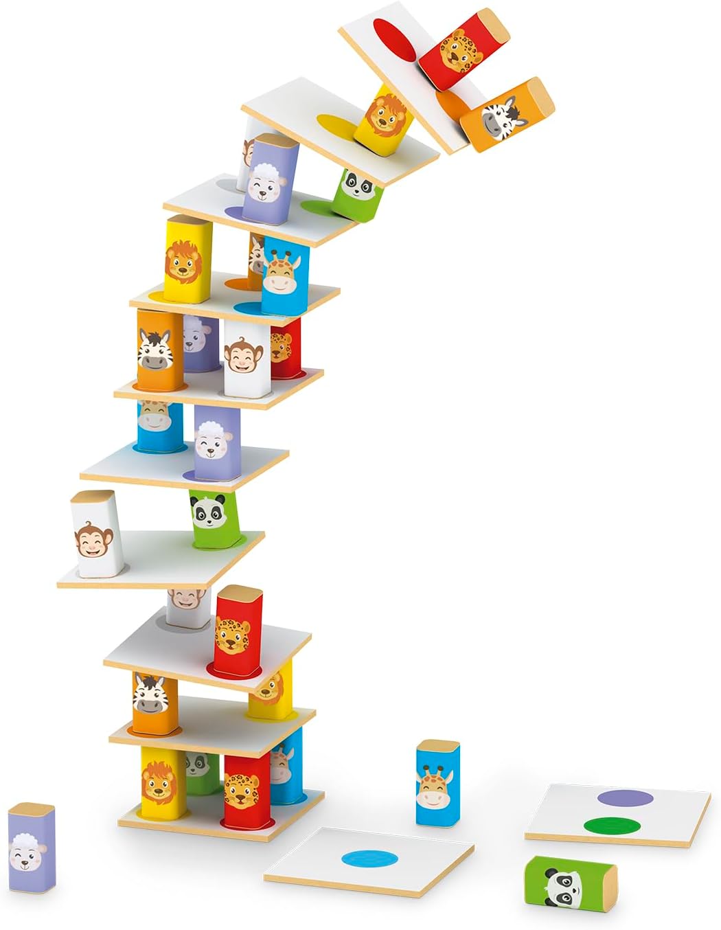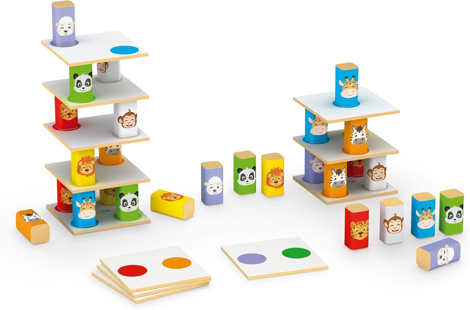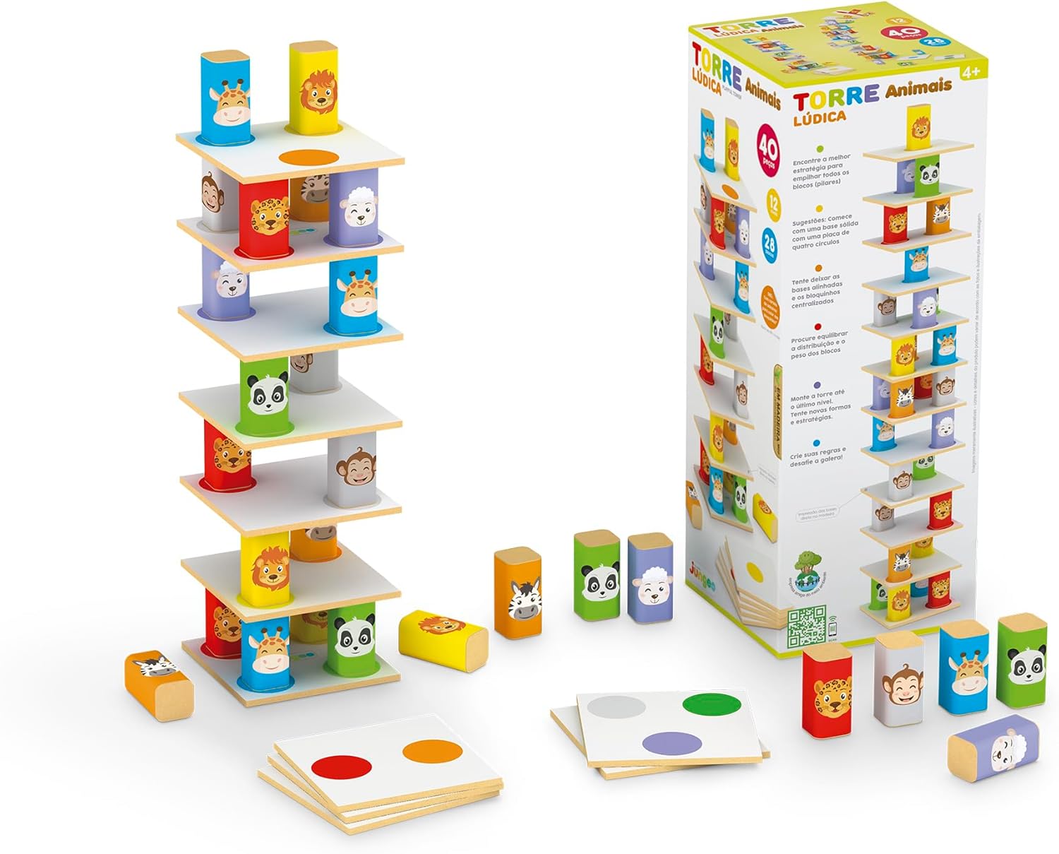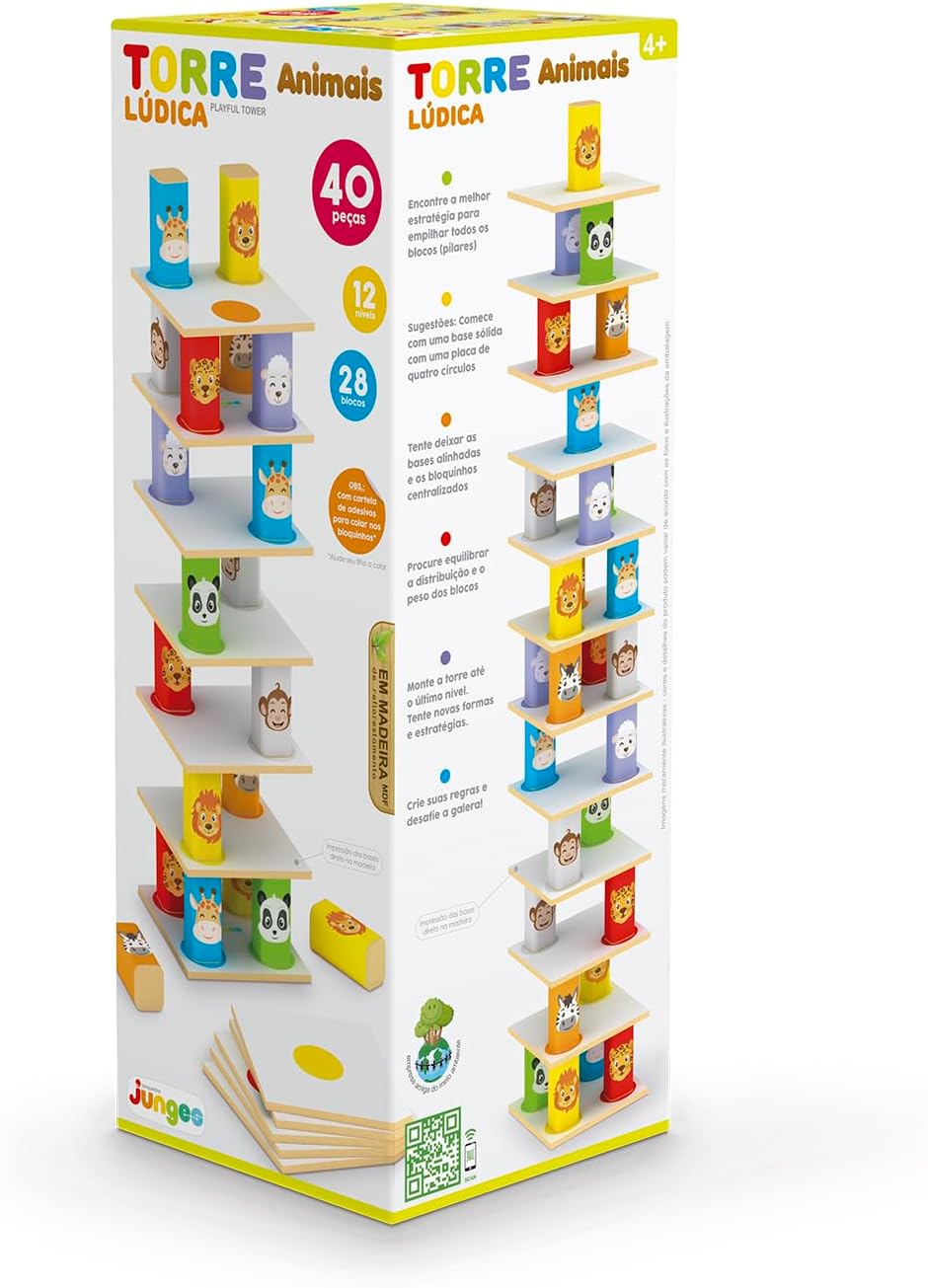 Torre Lúdica Animais da Junges com 40 peças em madeira de reflorestamento (MDF). Acompanha cartela de adesivos com temática infantil de animais para personalização. O objetivo do jogo é equilibrar as placas e peças umas sobre as outras de acordo com cada cor até que ela desabe. O participante que colocar a peça e a torre cair, perde o jogo. O jogo estimula a coordenação motora, concentração, raciocínio lógico, percepção e atenção. Divirta-se muito e não deixe a torre cair!